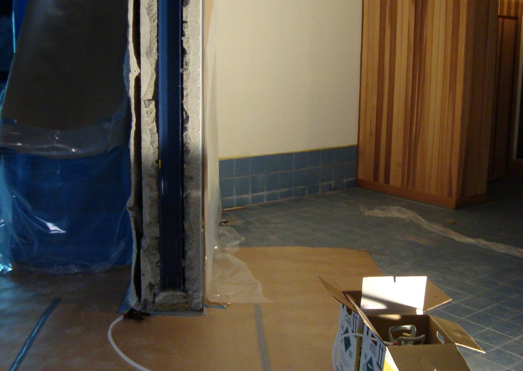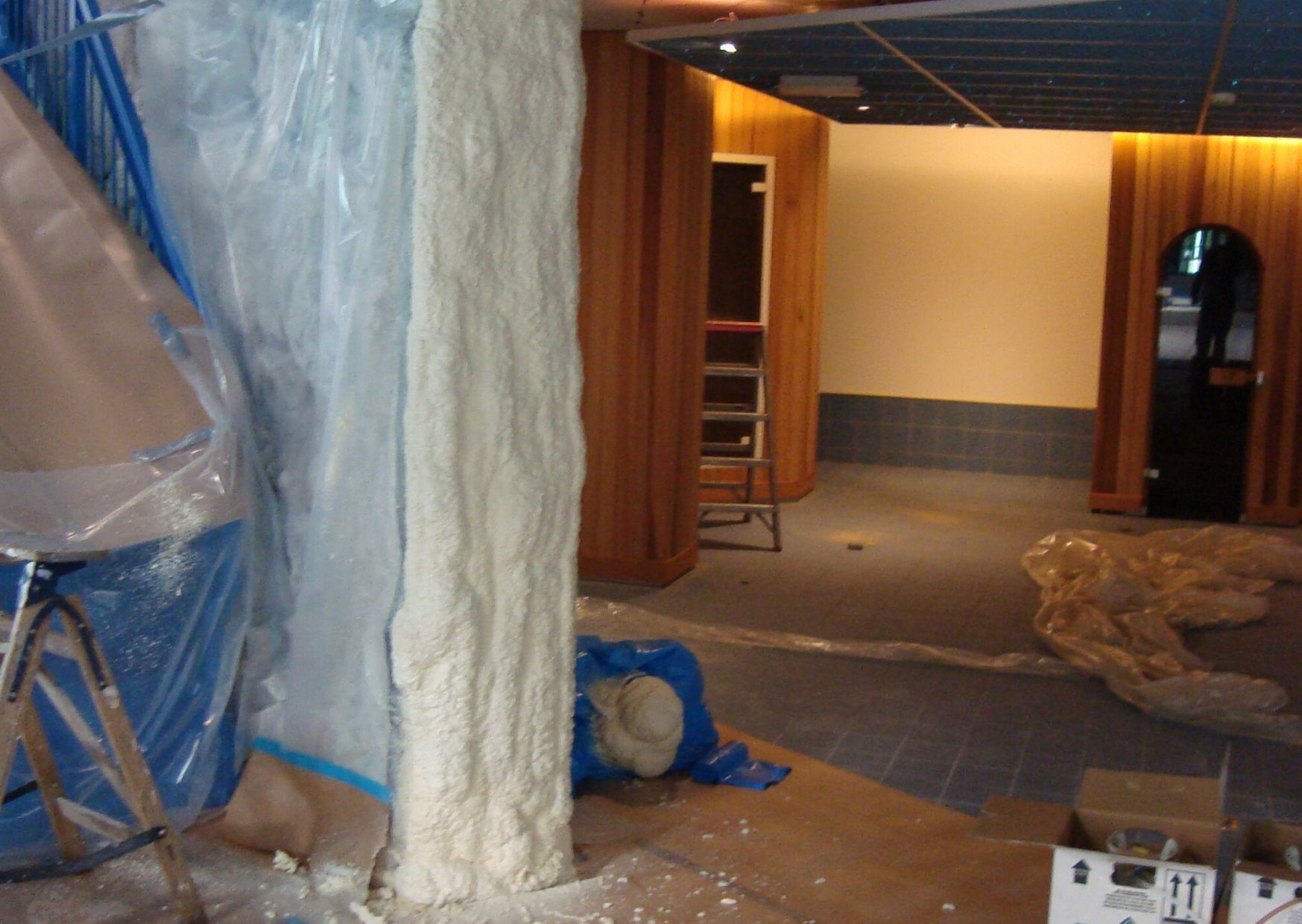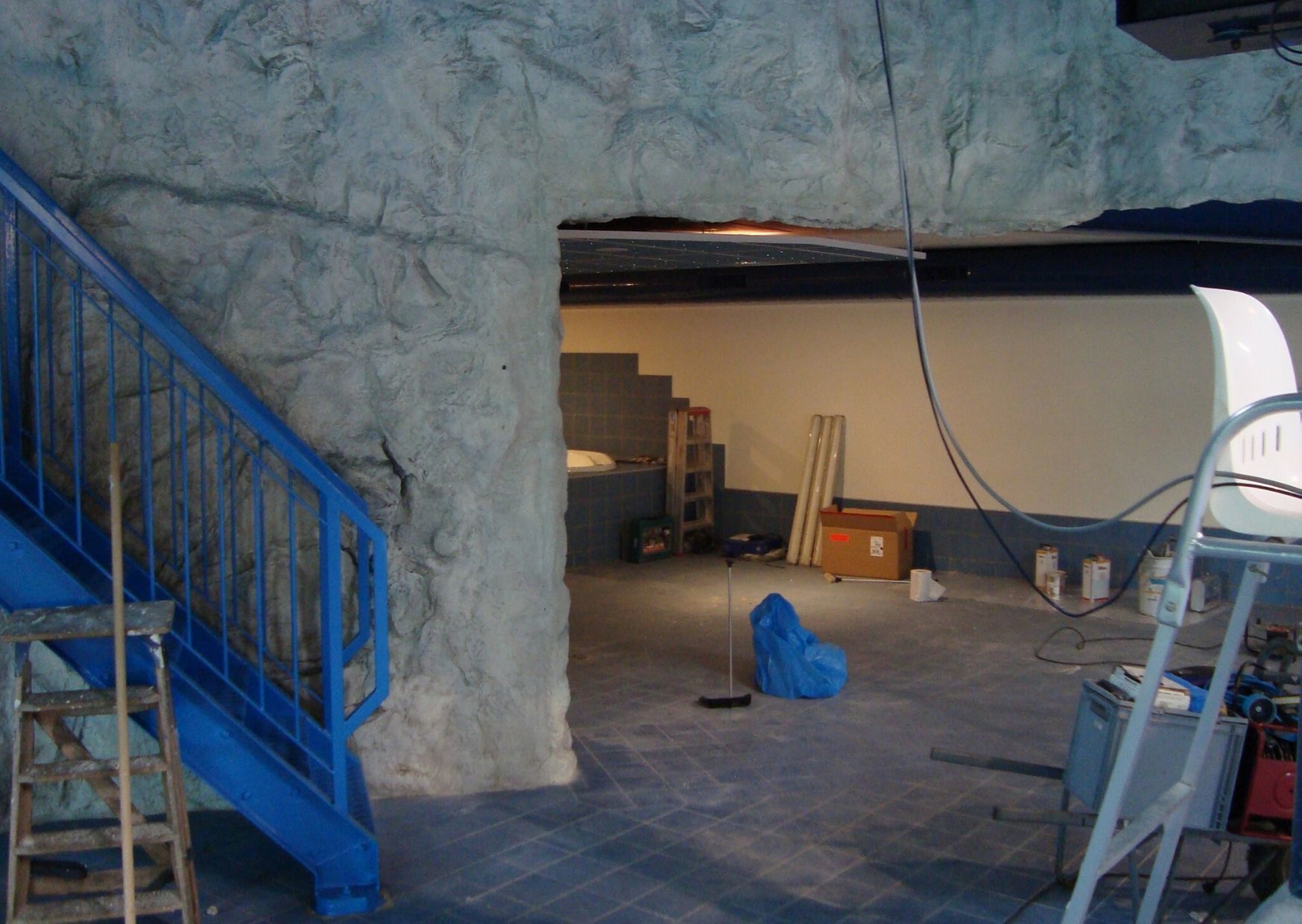 In deze zwemzaal hebben wij een rotswand gemaakt van schuim. Daarna hebben we de rotswand afgewerkt met kleurcoating.